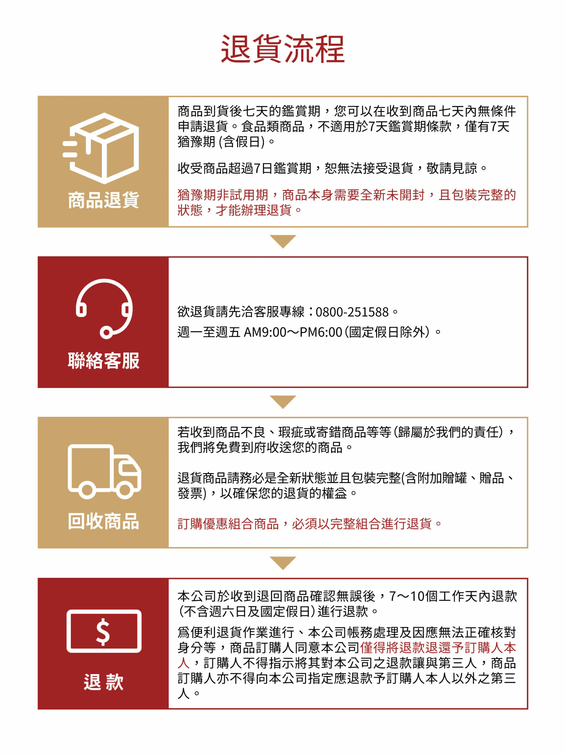 · 欲退貨請先洽客服專線:0800-251-588。週一至週五 AM9:00~PM6:00(國定假日除外)。
